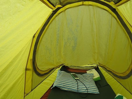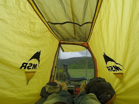 曇り時々雨の天気予報でしたが、雨が降る様子もなく、いつもの前室の広いコールマンのテントをやめてMSRのスキニ―ワンを張る事に。。