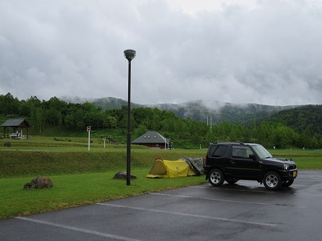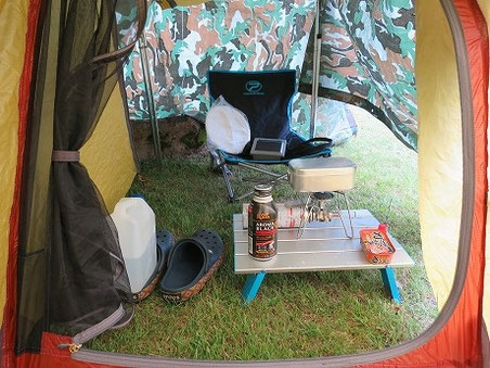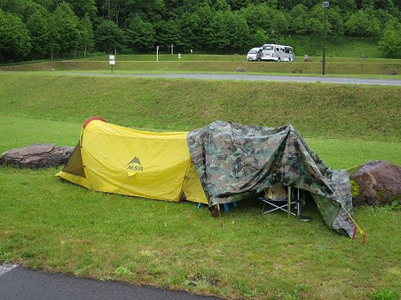 と思ったら、ザーザー雨が降ってきました。どうせ数時間で帰るし、一人なのでタープを張るのも面倒になり、クルマに積んであった迷彩柄のシートをテントの上から被せて前室代わりに。