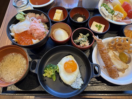 私は卵好きなので、目玉焼き・温泉卵・卵焼き・・とフルセット。