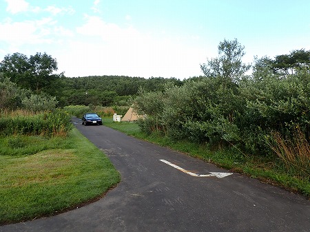 で、私が借りた「キャンピングカーサイト」たまたま誰かが歩いていましたが、ココが私の貸し切りスペースです。この日はサイト料だけで3,500円。意外と安いです。(入場料は大人1人500円)