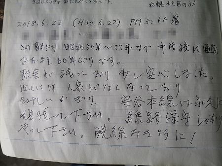駅には駅ノートがあって、訪問者が思い思いの事を書き残していました。